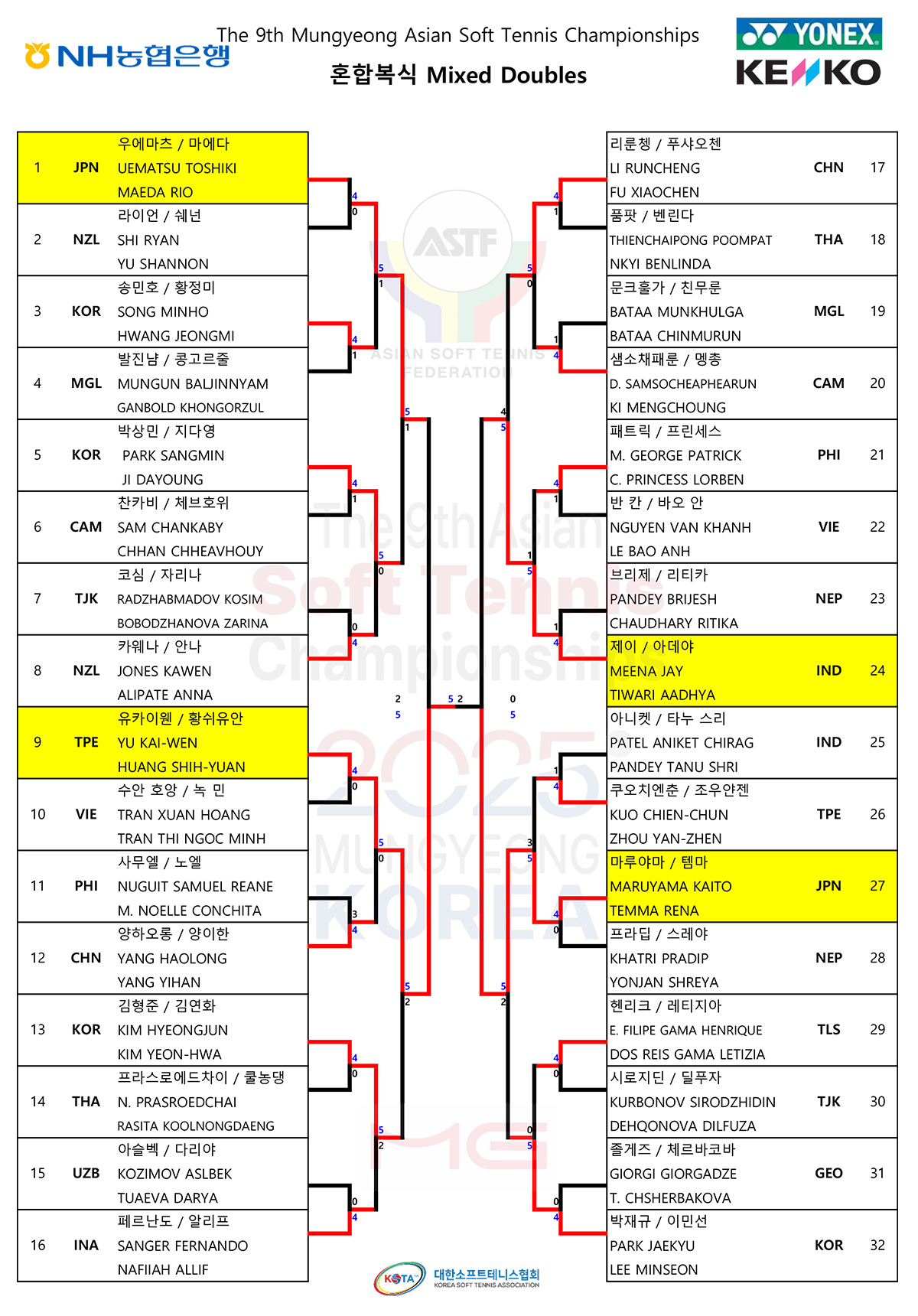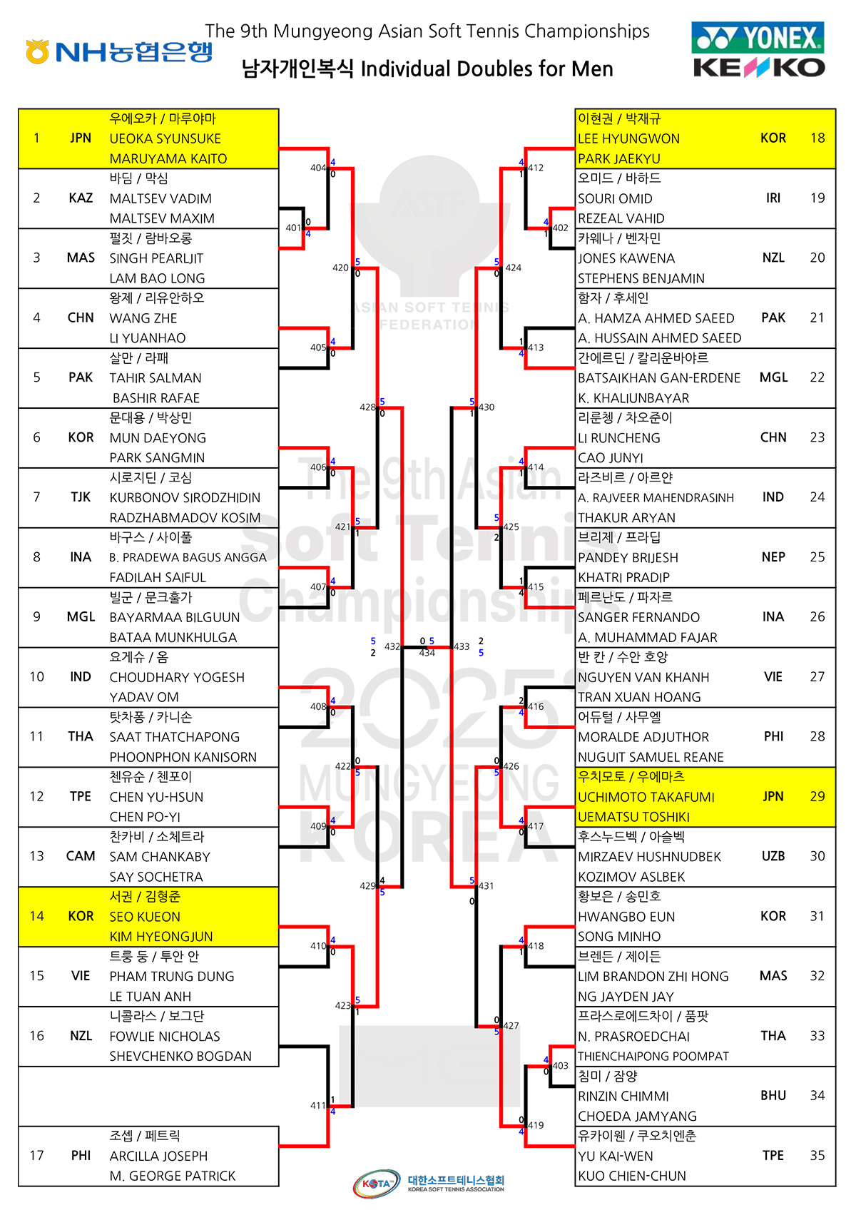 - 男子ダブルス : 李鈜受・楊鎮煥(韓国)