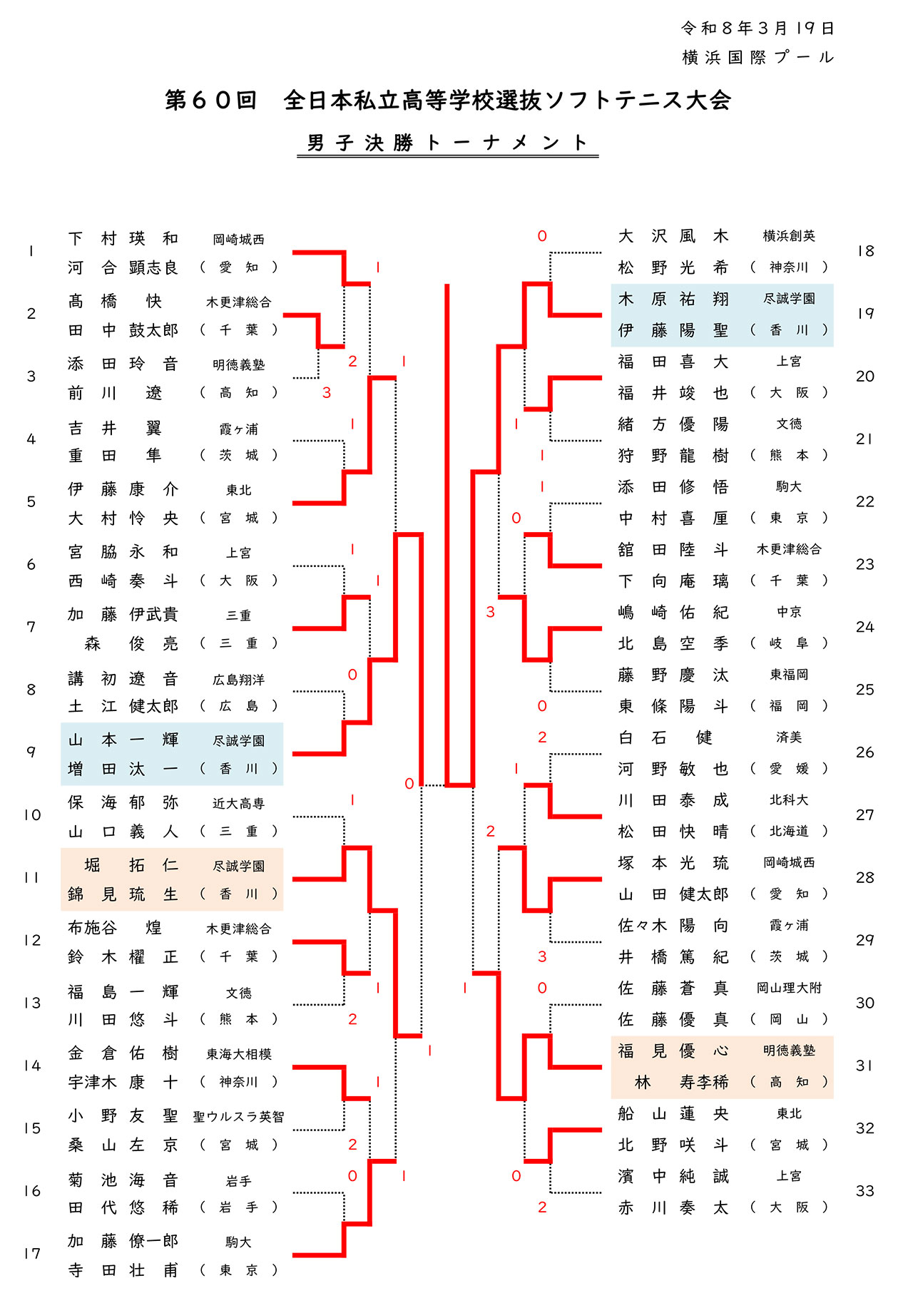 3月19日、第60回全日本私立高等学校選抜ソフトテニス大会の男子個人戦決勝トーナメントが行われ、木原祐翔・伊藤陽聖ペア(尽誠学園)が、同じく尽誠学園の山本一輝・増田汰一ペアとの同士討ち決勝を制して優勝を果たした。